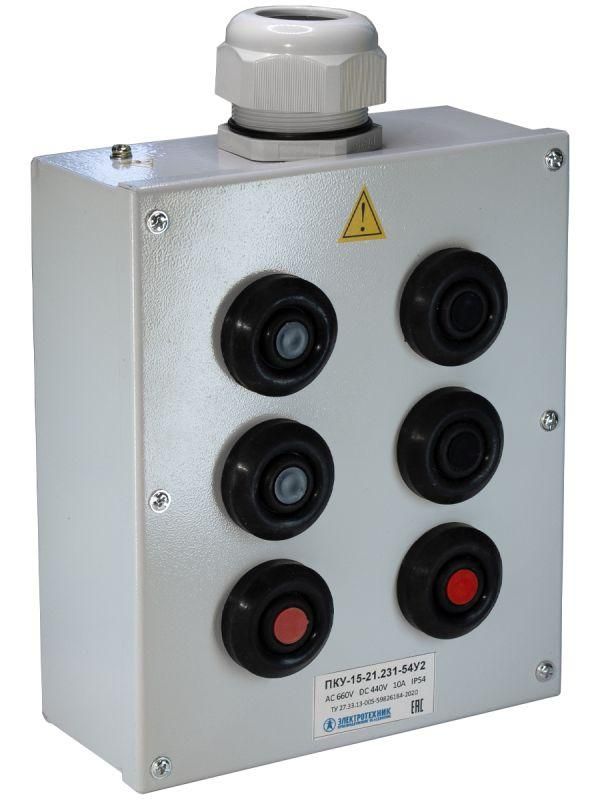 Пост управления ПКУ-15-21.231-54У2 (4хКЕ081/2(1з+1р) черная + 2хКЕ081/2(1з+1р) красная + PG-36) от бренда Электротехник предназначен для ручного управления электрическими цепями на промышленном оборудовании. Комплектация включает четыре черных и две красных кнопки с контактами, а также сальник PG-36 для ввода кабеля - всё в одном герметичном корпусе.