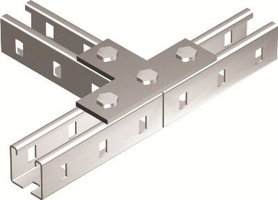 Пластина соединительная Т-образная горячеоцинкованная от DKC (ДКС), артикул bmd1031hdz, предназначена для надёжного соединения C-профилей в кабельных лотках, обеспечивая жесткую T-образную структуру даже в условиях повышенной влажности и агрессивной среды.