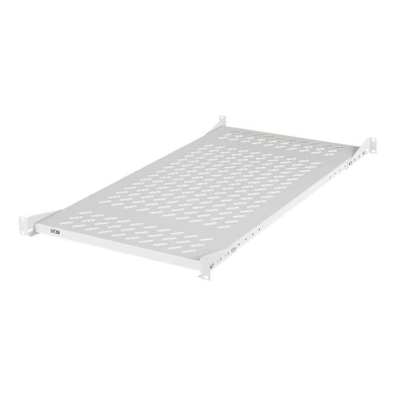 Полка выполнена из стали с двумя типами усилений: продольными и поперечными ребрами жесткости. Это предотвращает прогиб даже при максимальной нагрузке. Перфорированная поверхность позволяет воздуху проходить под оборудованием, снижая риск перегрева. Направляющие имеют фиксированные пазы - не требуется регулировка по высоте, так как полка является стационарной.