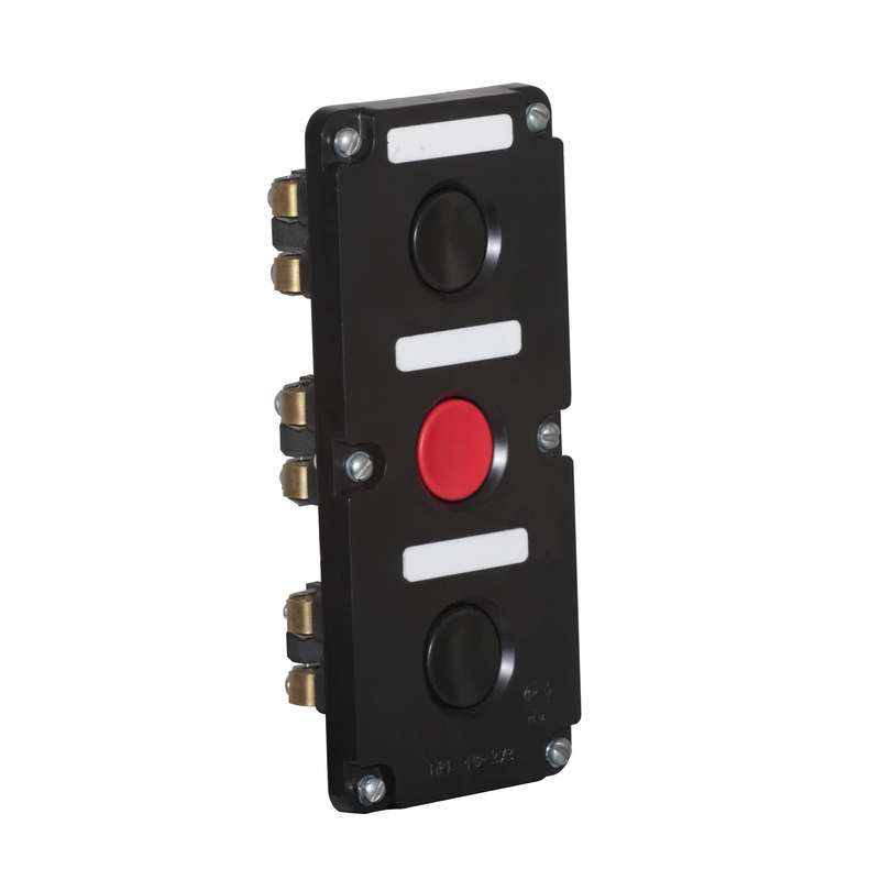 Пост кнопочный ПКЕ-112/3 Пуск-Стоп 2 черных 1 красная от бренда Электродеталь Воронеж - компактное устройство управления с тремя кнопками для команд «Пуск» и «Стоп» в системах автоматизации. Подходит для установки в ниши на щитах и оборудовании, где требуется надежное механическое управление.