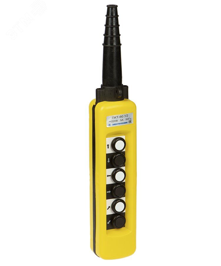 Пост кнопочный ПКТ-60 У2 от Электротехник - устройство для управления подъёмными механизмами через шесть отдельных команд: вверх, вниз, влево, вправо, вперёд, назад. Модель выполнена в прочном корпусе из поликарбоната с защитой IP65, что делает её надёжным решением для работы в запылённых и влажных средах.