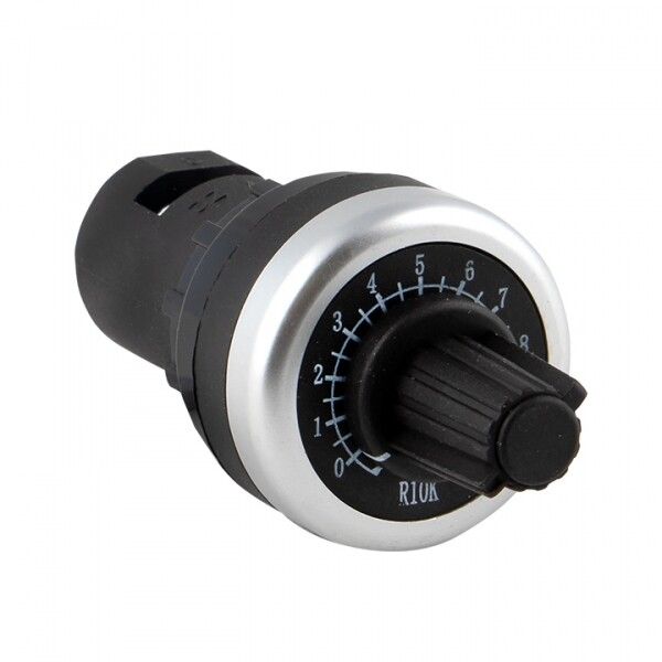 Потенциометр 10 кОм совместим с любыми схемами, где требуется изменение напряжения в пределах 10 кОм. Для монтажа необходимо просверлить в панели отверстие диаметром 22 мм - корпус плотно фиксируется гайкой с тыльной стороны. Клеммы рассчитаны на провода сечением до 2,5 мм2. Установка возможна как в щитах, так и на передних панелях станков, пультов управления или тестового оборудования.
