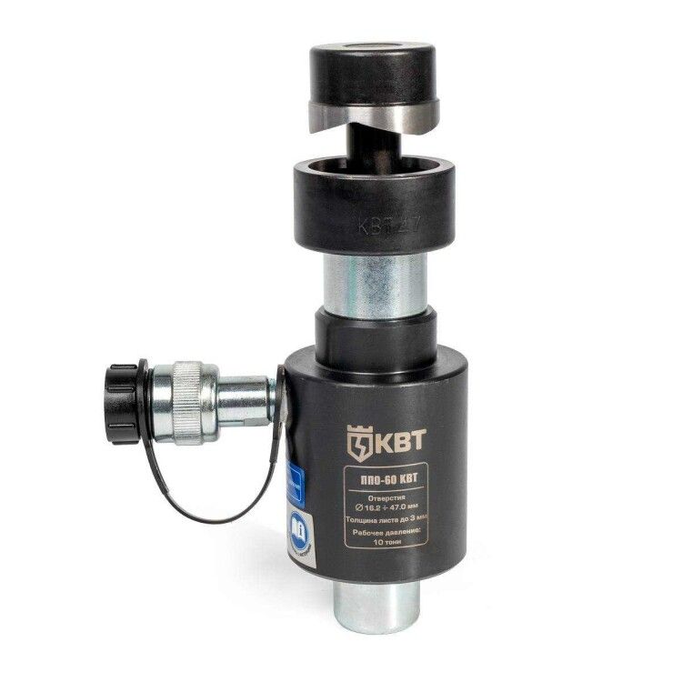 Пресс гидравлический для пробивки отверстий ППО-60 серия ПРОФИ, КВТ комплект предназначен для создания круглых, квадратных и прямоугольных отверстий в листовом металле толщиной до 3 мм. Инструмент применяется при монтаже щитов, шкафов, кабельных трасс, панелей управления и других конструкций из стали. Особенно эффективен там, где нельзя использовать сверление - например, при работе с уже установленными элементами или в условиях ограниченного доступа.