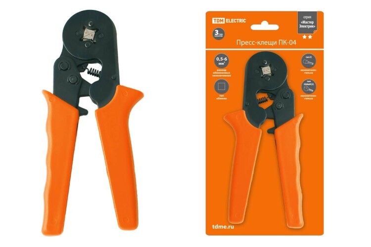 Пресс-клещи ПК-04 | SQ1001-0005 TDM ELECTRIC - это эргономичный инструмент, предназначенный для опрессовки кабельных концевых гильз. Он обладает небольшими размерами и легким весом, что делает его удобным в использовании. Пресс-клещи оснащены информативной и привлекательной упаковкой с подвесом, что облегчает их хранение и транспортировку.