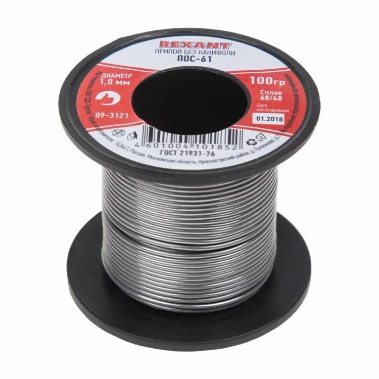 Припой катушка ПОС-61 без канифоли (диаметр 1,0 мм, 100 г, олово 61%, свинец 39%) от REXANT - это проволочный припой на основе оловянно-свинцового сплава для надёжной пайки и лужения электронных компонентов, печатных плат и металлических деталей. Отсутствие флюса требует самостоятельного нанесения активирующего состава.