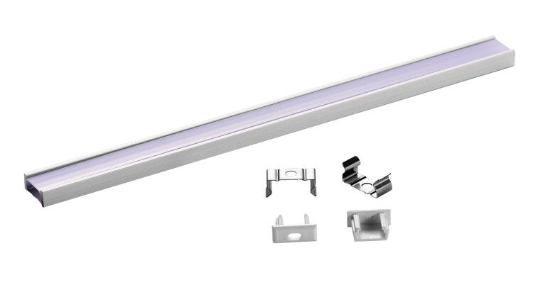 Профиль анодированный накладной 2 м – 1 шт., рассеиватель матовый – 1 шт., заглушка торцевая глухая – 1 шт., заглушка торцевая сквозная – 1 шт., крепежная клипса – 2 шт.