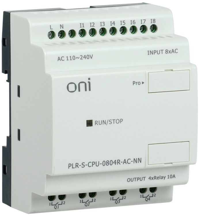 Реле логическое программируемое PLR-S. CPU0804(R) 220В AC без экрана от ONI - компактный контроллер для реализации простых логических алгоритмов в системах автоматизации. Устройство работает от сети 220 В переменного тока, имеет встроенные 8 цифровых входов и 4 релейных выхода, поддерживает связь по MODBUS и предназначено для установки на стену. Артикул plr-s-cpu-0804r-ac-nn подойдёт для задач, где не требуется расширение или сложная визуализация.