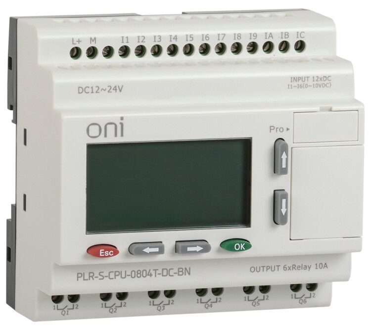 Реле логическое программируемое PLR-S. CPU0804(T) 24В DC с экраном ONI - компактный контроллер с интегрированным дисплеем, предназначенный для автономной логической обработки сигналов и управления оборудованием на базе 24 В постоянного тока. Устройство сочетает функции логического реле и мини-ПЛК, не требует внешних модулей расширения и подходит для задач автоматизации средней сложности.