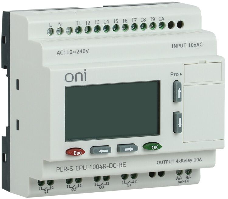 PLR-S. CPU1004(R) 24В DC с экраном ONI используется как программируемый логический контроллер для реализации базовой автоматики: управление насосами, вентиляторами, клапанами, светильниками, конвейерами. Устройство заменяет несколько обычных реле и таймеров, позволяя задавать сложную логику работы через ПО. Применяется в системах малой и средней сложности - на производствах, в ЖКХ, на объектах энергообеспечения и в автоматизированных шкафах.