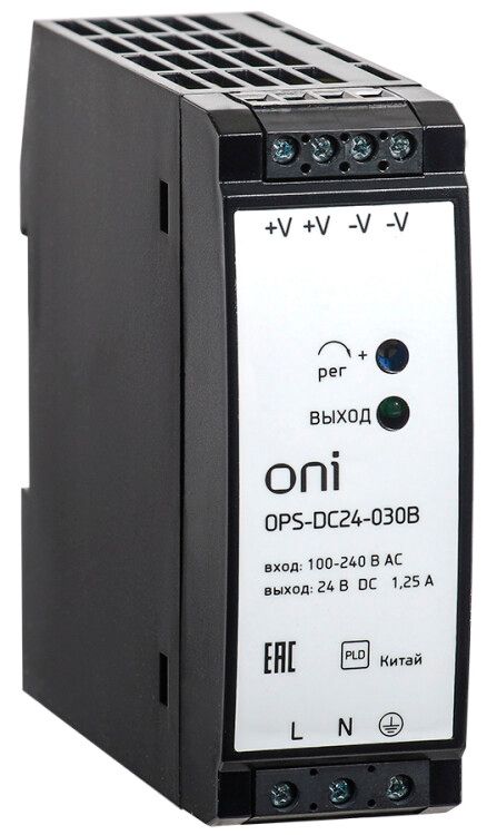 Промышленный импульсный блок питания ONI. Диапазон входных напряжений 90-264В AC или 127-370В DC. Номинальное выходное напряжение 24В Номинальный выходной ток 1,25 А. Номинальная мощность 30Вт. Защиты от перенапряжения и перегрузки - OPS-DC24-030B IEK