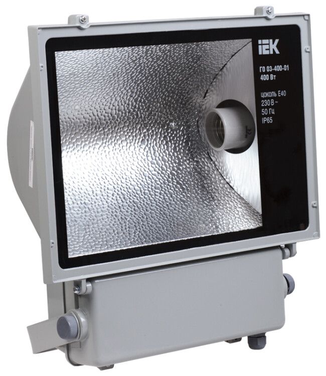 Прожектор ГО 03-400-01 400Вт IP65 E40 серый симметричный имеет встроенный ЭмПРА и цоколь E40 - совместим со всеми стандартными металлогалогенными лампами этого типа. Для замены лампы достаточно открыть переднюю крышку, не трогая провода.