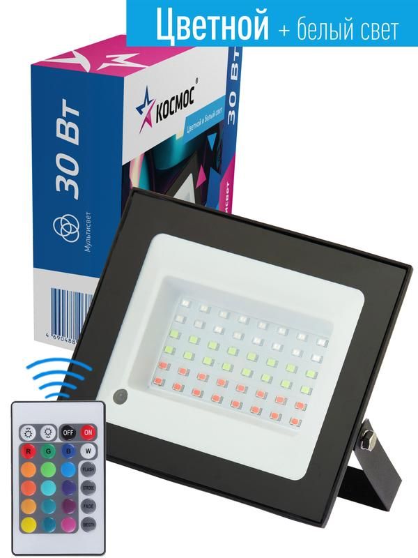 Прожектор светодиодный 30 Вт, RGB, с пультом управления, 6500 К, IP65, 2400 лм, 20 режимов работы от бренда КОСМОС - это универсальное устройство для декоративной и функциональной подсветки внешних объектов. Модель обеспечивает яркий холодный белый свет и широкую палитру цветов, управляемых с пульта, и рассчитана на длительную работу в сложных условиях.