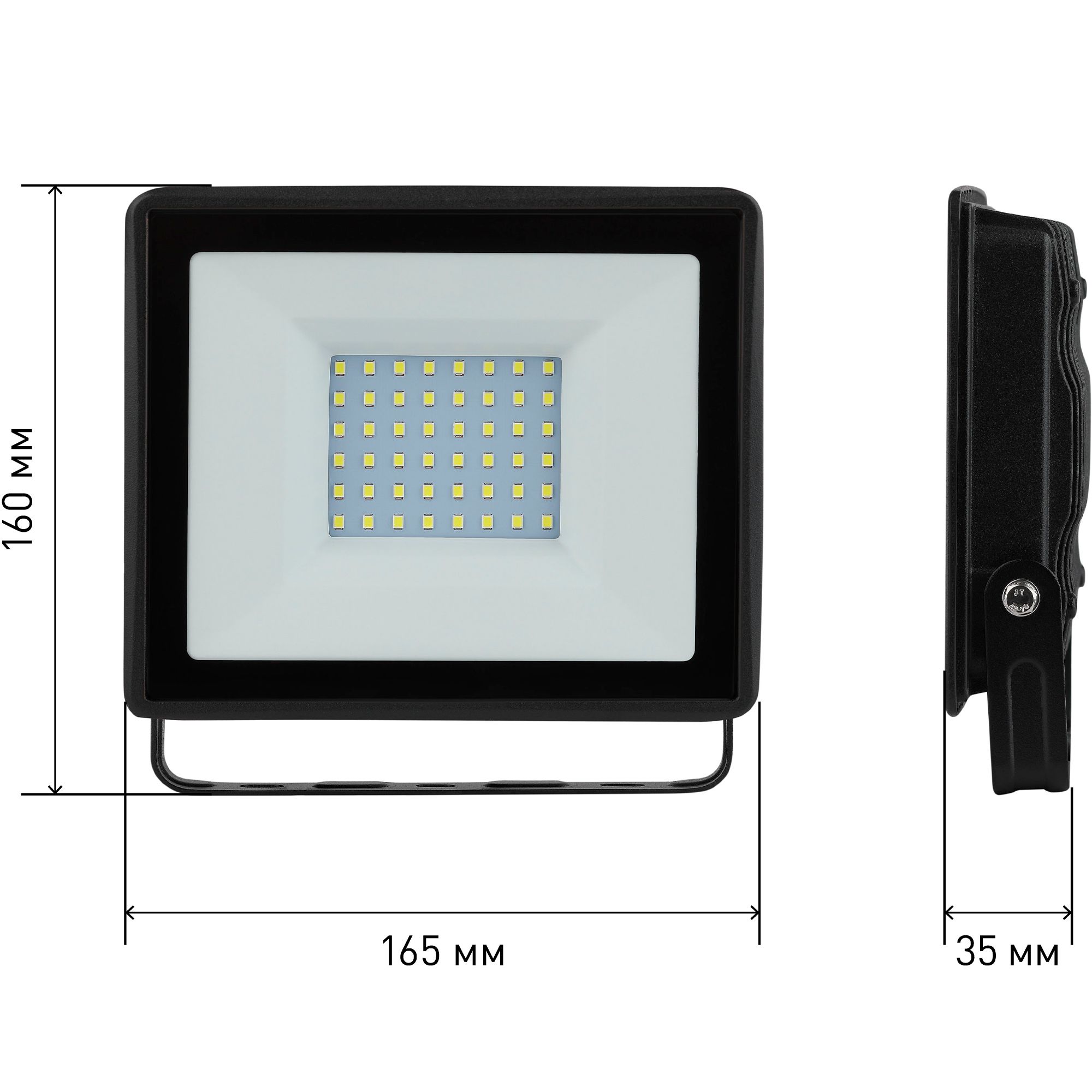 Прожектор светодиодный уличный 70Вт 6500К 5600Лм IP65 165х160х35 поставляется с готовой монтажной скобой. Установка выполняется на вертикальные или горизонтальные поверхности: стену, столб, фасад. Для крепления используются два болта M8 (не входят в комплект). Поворотный механизм позволяет изменить угол наклона прожектора в пределах +-45° без демонтажа. Подключение осуществляется через винтовые клеммы - подходящее сечение провода: 0,75–2,5 мм2. Заземление обязательно! Нельзя использовать с удлинителями или переходниками без заземляющего контакта.