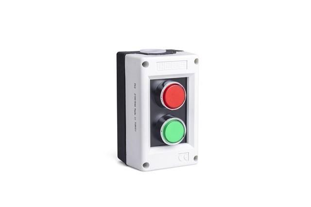 Пост управления PK2 от бренда EMAS - компактное устройство с двумя кнопками (красной и зелёной), каждая из которых имеет один нормально открытый и один нормально замкнутый контакт. Подходит для управления оборудованием на напряжение до 240 В переменного тока с нагрузкой до 4 А. Корпус из пластика обеспечивает базовую защиту от внешних воздействий, а серый-черный цвет соответствует промышленным стандартам эргономики.