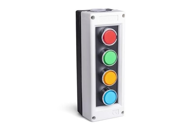 Пульт управления EMAS PK4 - компактное устройство с четырьмя цветными кнопками для ручного управления оборудованием на напряжение до 240 В переменного тока. Подходит для установки на панели станков, автоматических линий и других систем, где требуется надежная механическая кнопочная коммутация.