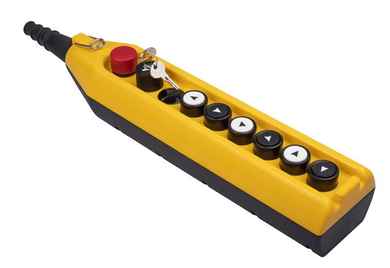 Пульт управляет одноканальным оборудованием через восемь функциональных клавиш, включая специальную кнопку ключ-марка для активации режима обслуживания и кнопку аварийного стопа для экстренного отключения. Подходит для установки на станках, конвейерах, насосных системах и других устройствах, где требуется физический контроль оператора. Применяется в цехах, на складах, в пищевой и химической промышленности, где важна устойчивость к внешним воздействиям.