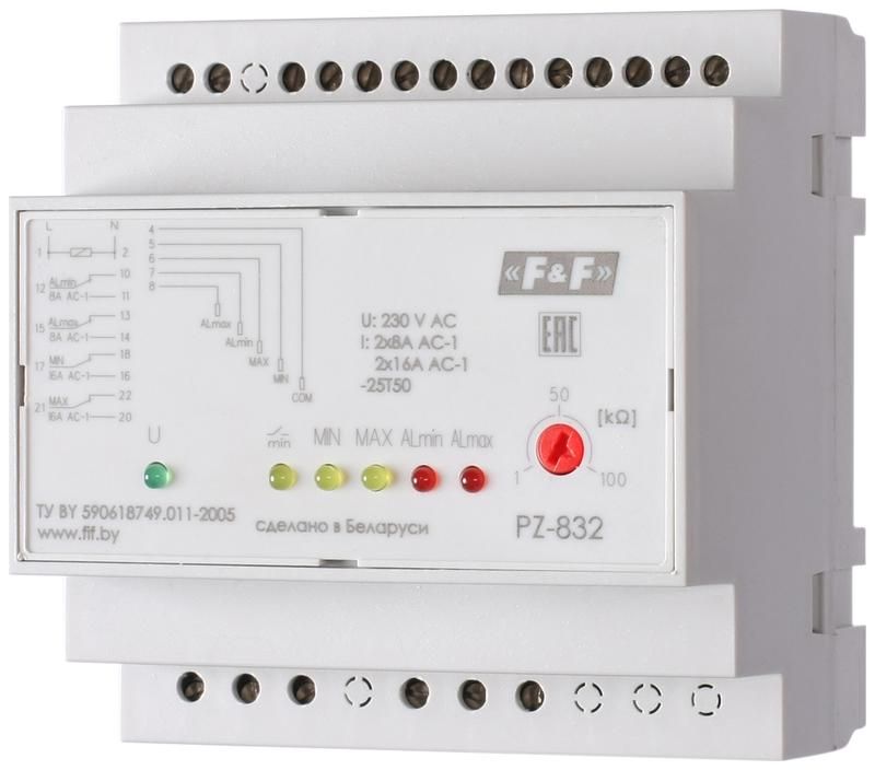 Реле уровня PZ-832 (без датчиков 4-х уровневый контроль аварийных макс. и мин. уровней монтаж на DIN-рейке 35мм 230В AC 2х8А + 2х16А 2перекл. 2НО IP20) F&F EA08.001.012 Евроавтоматика