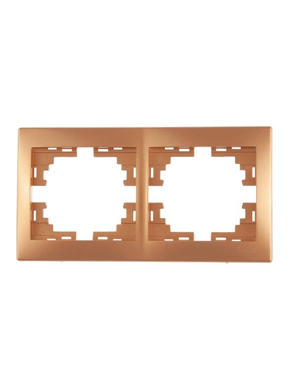 Рамка 2-постовая горизонтальная без вставок металлик золото от бренда Lezard, артикул 701-1300-147, предназначена для декоративного оформления установочных мест под выключатели и розетки в составе серии MIRA. Она не содержит внутренних элементов - используется исключительно как внешняя рамка.