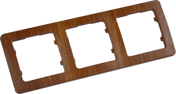 Рамка трёхместная скрытой установки, цвет дуб используется исключительно как декоративная накладка на три модульных устройства - например, два выключателя и одна розетка. Она не содержит контактов, не является элементом электрической цепи и не обеспечивает защиту от тока. Применяется в жилых помещениях, офисах, гостиницах и других объектах с внутренней электропроводкой, где установлены стандартные подрозетники.