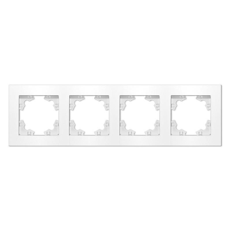 Рамка четырехместная горизонтальная универсальная белая (евросlot) предназначена для установки внутри стен в местах, где требуется размещение нескольких электротехнических модулей: выключателей, розеток, диммеров, телекоммуникационных разъёмов или USB-портов. Подходит для жилых помещений, офисов, общественных зданий. Используется исключительно в составе серии «Афина» - другие рамки не совместимы по форме и креплениям.