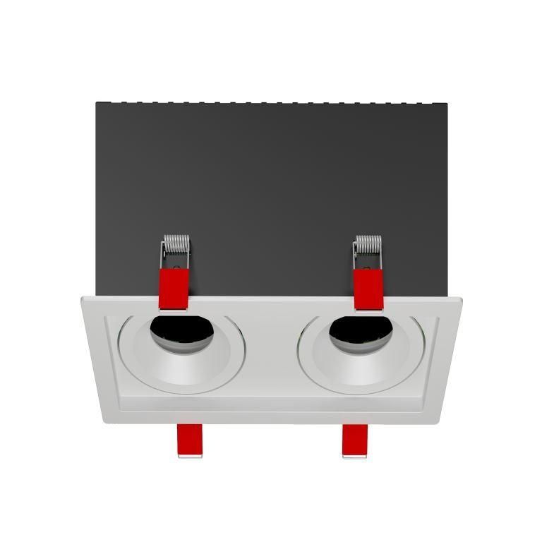 Рамка выполнена из тонколистового алюминия с точной штамповкой, что гарантирует одинаковые геометрические параметры даже при массовом выпуске. Благодаря поворотному механизму можно компенсировать допущенные погрешности при резке отверстия. Наличие двух камер позволяет одновременно установить два светильника FLEX 50 12 - экономично и эстетически целостно.