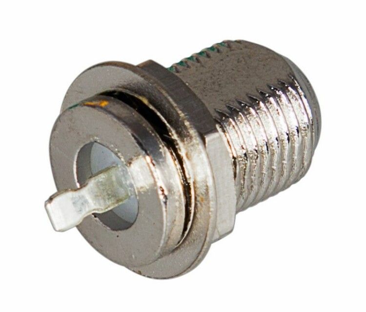 Разъем гнездо F на корпус с контактом монтируется в отверстие диаметром 8–9 мм на стенке устройства. Кабель RG-6 зачищается по технологии для F-разъема: центральная жила выводится на 4–5 мм, экранирующая оплетка отгибается назад. Разъем плотно закручивается гайкой до упора - звук щелчка указывает на правильную посадку. Не требует пайки, что ускоряет установку.