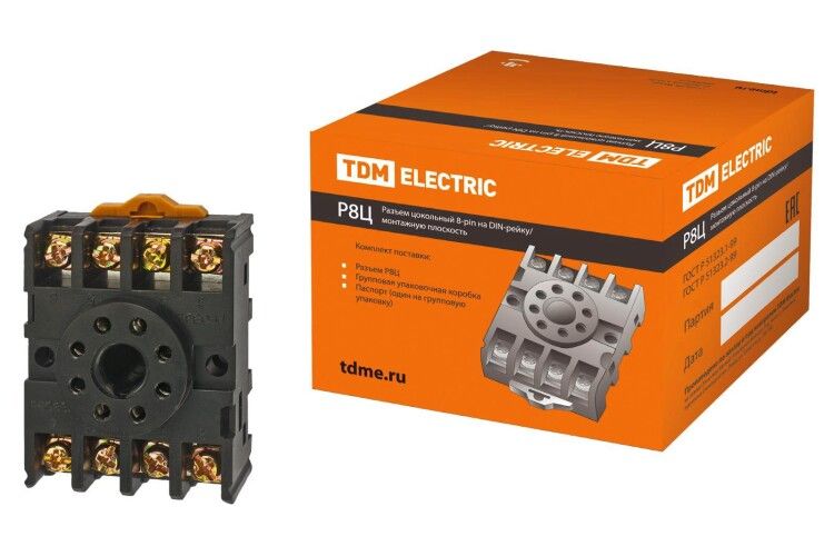 Разъем Р8Ц – цокольный 8-пин на DIN-рейку или плоскость от TDM ELECTRIC (артикул sq1503-0019) предназначен для надежного подключения коммутационных устройств, таких как реле времени, таймеры и реле контроля фаз, обеспечивая простой и безопасный монтаж на стандартной рейке или поверхности.