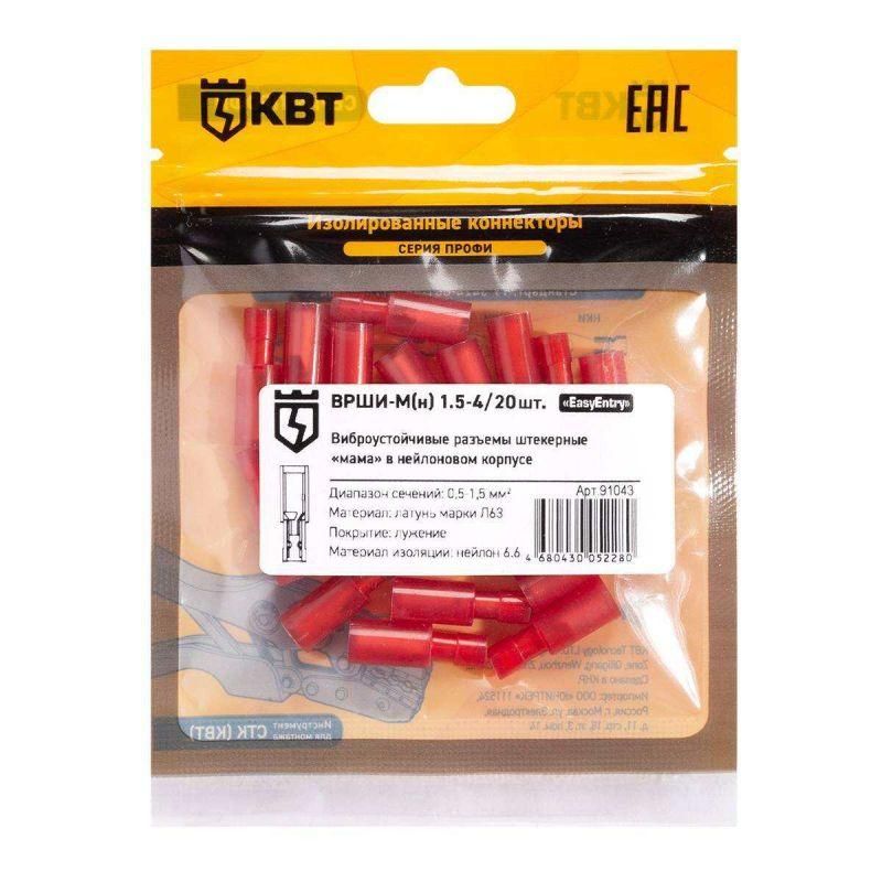Разъем штекерный изолированный мама ВРШИ-М(н) 1.5-4 от бренда КВТ - это защищённый соединитель для многопроволочных медных проводов, предназначенный для надёжного и безопасного быстроразъёмного подключения в условиях повышенной влажности, пыли или вибрации. Упаковка содержит 20 штук, что удобно для закупок и замены.
