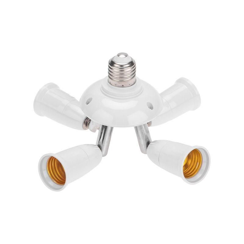Разветвитель цокольный E27-4xE27 белый поворотный цоколь устанавливается вместо обычного патрона. Его основание имеет стандартную резьбу E27, которая вворачивается в штатный патрон светильника. Каждый из четырёх выходов также выполнен в формате E27 - в них вкручиваются лампы. Защёлки обеспечивают дополнительную фиксацию внутри корпуса светильника, предотвращая проворачивание. Поворотный механизм каждого патрона позволяет менять угол направленности света - удобно при необходимости акцентного освещения.