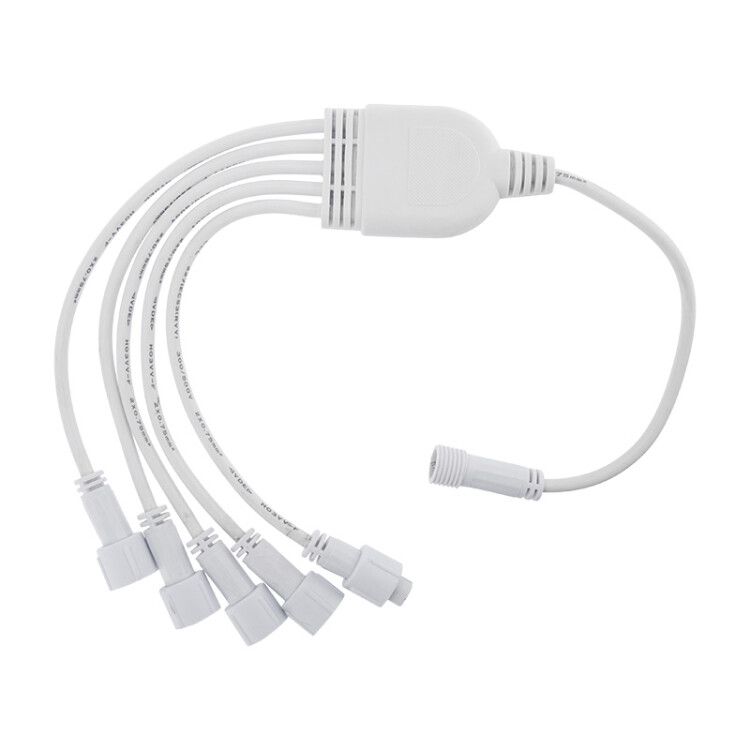 Разветвитель -Y для уличных гирлянд (1 вход, 5 выходов) белый поливинилхлорид NEON-NIGHT, NEON-NIGHT(н) предназначен для распределения электроэнергии от одного источника питания между несколькими световыми декорациями. Он решает проблему перегрузки розеток и хаотичного расположения проводов при украшении фасадов, террас, садов и новогодних композиций. Применяется в частном домостроении, коммерческом оформлении и городском освещении.
