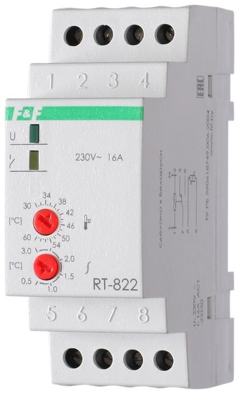 Регулятор температуры RT-822 (от +30 до +60 град.C; выносной датчик; монтаж на DIN-рейке 35мм 50-260В 16А 1P IP20) F&F EA07.001.005 Евроавтоматика