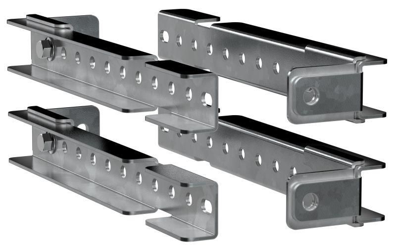Рейка для регулируемого монтажа панели 400 крепится к стенкам шкафа или корпуса с помощью болтов через круглые отверстия. Установка выполняется параллельно друг другу на противоположных сторонах - одна пара для верхней части панели, вторая - для нижней. Глубина фиксации регулируется за счёт перемещения панели между рейками до нужного уровня. Для надёжной фиксации рекомендуется использовать болты M4–M5. Просечки рассчитаны под стандартные метрические крепёжные элементы, что исключает необходимость специальных инструментов.