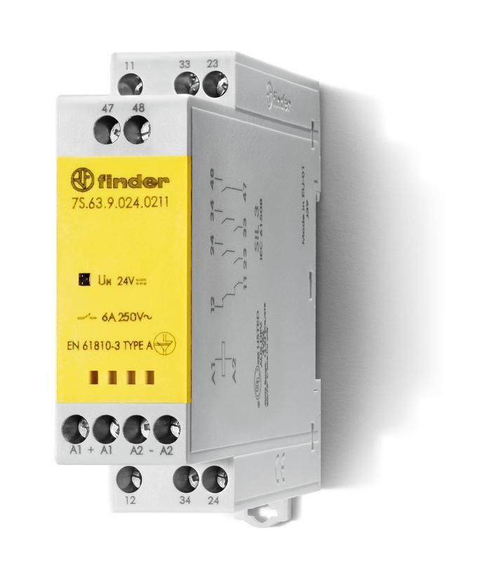 Реле безопасности модульное электромеханич. (реле с принудительным управлением контактами) 2NO+1NC+1 AUX(доп.контакт) 6А AgSnO2 48В DC винт. клеммы 22.5мм IP54 FINDER 7S6390480211
