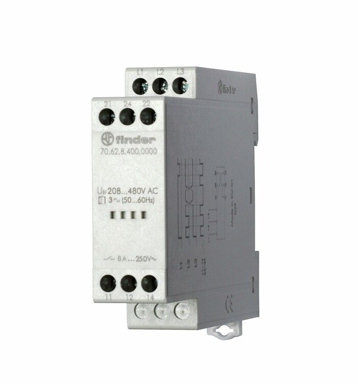 Контрольное реле для 3-фазных сетей; обрыв/чередование фаз, фиксированные регулировки; выход 2CO 8А | 706284000000 Finder 70.62.8.400.0000