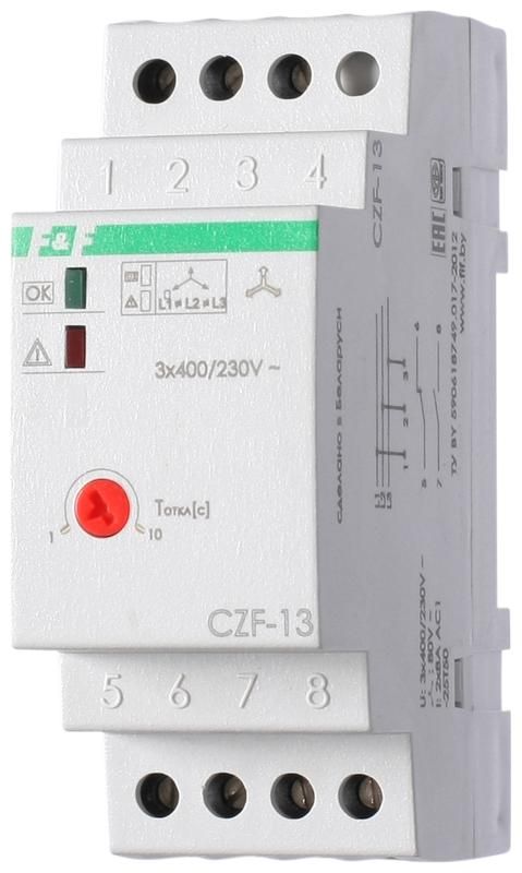 Реле контроля фаз для сетей с изолированной нейтралью CZF-13 (монтаж на DIN-рейке 35мм; регулировка задержки отключения; 3х400В 8А 1Z 1R IP20) F&F EA04.004.004 Евроавтоматика