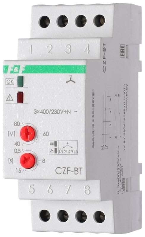 Реле контроля фаз CZF-BT регулировка асимметрии и времени отключения 3х230В+N 2х8А 1НО+1НЗ F&F EA04.001.004 Евроавтоматика