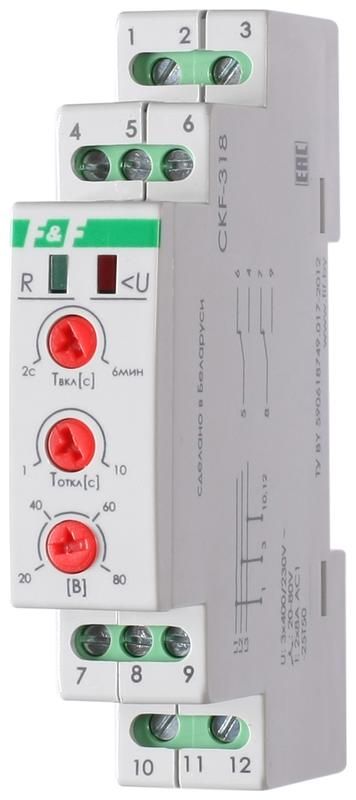 Реле контроля фаз для сетей с изолированной нейтралью CKF-318 (монтаж на DIN-рейке 35мм; регулировка порога отключения; контроль чередования фаз; 3х400В 8А 2P IP20) F&F EA04.004.007 Евроавтоматика