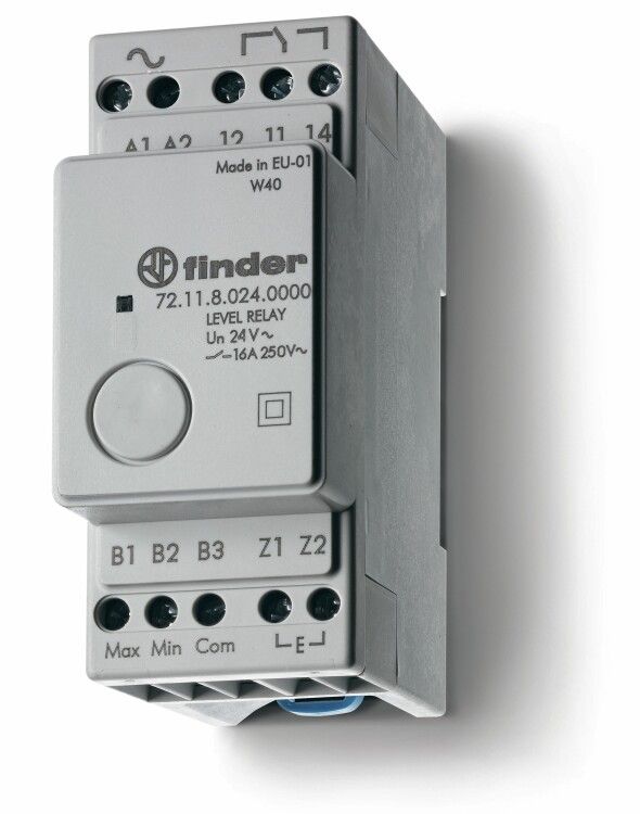 Реле контроля уровня Finder 72.11.8.240.0000 - компактное модульное устройство для автоматического контроля наличия жидкости в ёмкостях по проводимости, рассчитанное на работу с напряжением 240 В переменного тока и коммутацией нагрузки до 16 А.