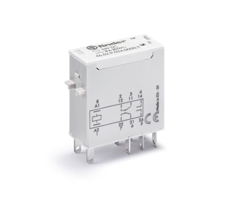 Реле Finder 46.52.9.110.0000t совместимо с розетками серии 46, а также может монтироваться напрямую на штекеры Faston 2,5×0,5 мм. Для монтажа в розетку достаточно вставить корпус в гнездо - фиксация механическая, без инструментов. При использовании без розетки контакты подключаются к проводам с наконечниками того же размера. Катушка имеет свободную поляризацию - можно подключать +-110 В в любом направлении. Не требует внешней демпфирующей схемы при работе с индуктивными нагрузками ниже 8 А.