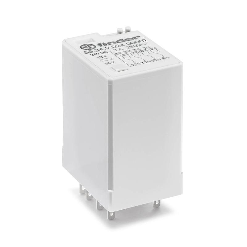 Реле миниатюрное универсальное электромеханическое, монтаж в розетку, 4CO 7A, контакты AgNi, катушка 230В АC, степень защиты RTI, опции: нет, специальная версия для Ж/Д-транспорта - 553482300000T FINDER