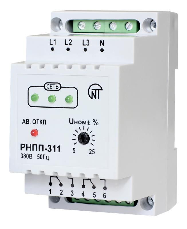 Реле напряжения трехфазное РНПП-311 контролирует уровень напряжения в трёхфазной сети переменного тока и отключает потребителей при опасных отклонениях - как при снижении, так и при повышении напряжения. После возврата параметров в нормальный диапазон устройство самостоятельно включает питание с задержкой. Применяется для защиты двигателей, насосов, компрессоров, конвейеров и другого промышленного оборудования, чувствительного к перепадам напряжения.