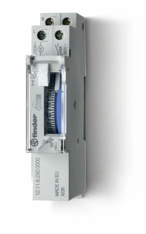 Реле времени механическое суточное, монтаж на рейку 35мм, 1NO 16A, питание 230В АC, ширина 17.6мм, без резервн.источника питания, степень защиты IP20 - 12.11.8.230.1000 FINDER 121182301000