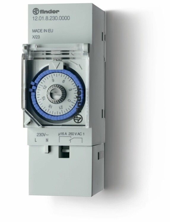 Реле времени механическое суточное; монтаж на рейку 35мм; 1СO 16A; питание 230В АC; ширина 35.8мм; степень защиты IP20 | 120182300000 Finder 12.01.8.230.0000