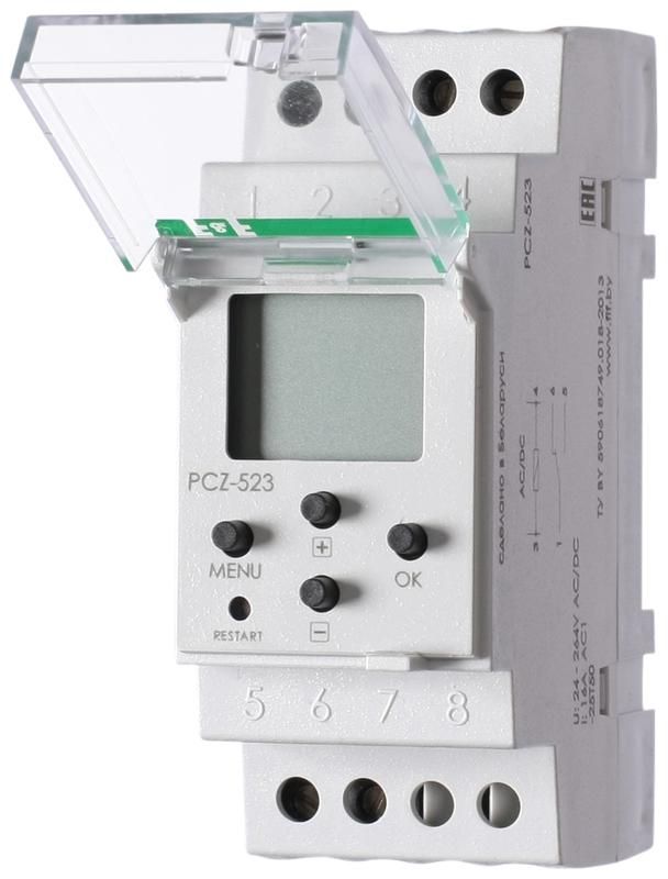 Реле времени PCZ-523 от Евроавтоматика - устройство для автоматического управления нагрузками по расписанию с точностью до секунды. Подходит для монтажа на DIN-рейку, питается от переменного или постоянного тока 24–264 В, коммутирует до 16 А. Артикул ea02.002.003.