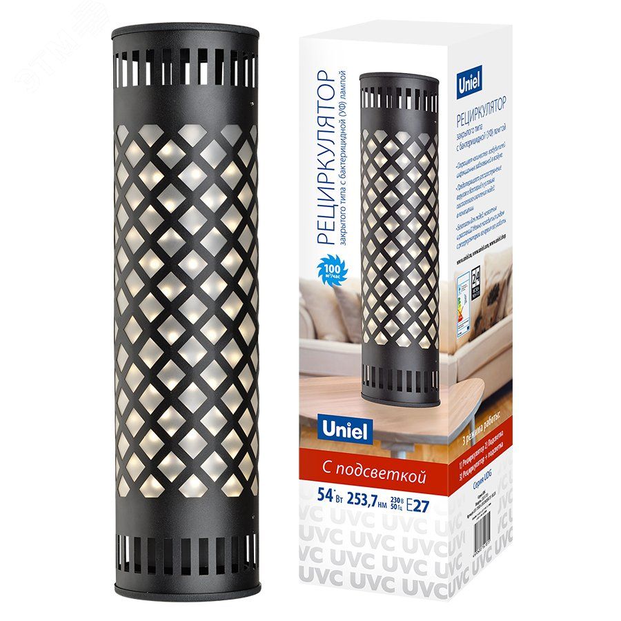 Рециркулятор настольный закрытого типа с лампой E27 без озонирования 253.7 нм UDG-V100A UVCB/4000K D01 BLACK предназначен для обеззараживания воздуха в помещениях с помощью ультрафиолетового излучения. Устройство от бренда Uniel работает без образования озона, что делает его безопасным для постоянного использования в офисах, медицинских кабинетах и домашних условиях.