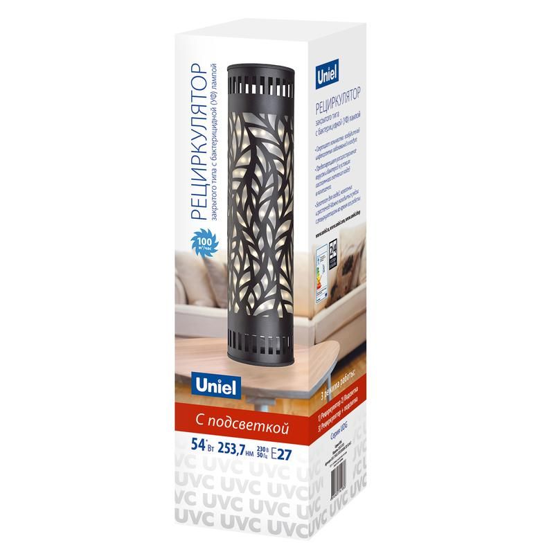 Рециркулятор настольный закрытого типа с лампой E27 без озонирования 253.7нм UDG-V100A UVCB/4000K D02 BLACK предназначен для обеззараживания воздуха в помещениях с помощью ультрафиолетового излучения. Устройство от бренда Uniel работает безопасно - без выделения озона - и подходит для постоянного использования в офисах, медицинских кабинетах и домашних условиях.