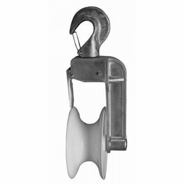 Ролик (PM 1) основан на технологии растяжки СИП по опорам и предназначен для использования на промежуточных опорах. Он имеет удобный поворотный крюк для подвеса на арматуру СИП. Благодаря откидной щеке, выемка провода после его раскатки становится легкой и безопасной.