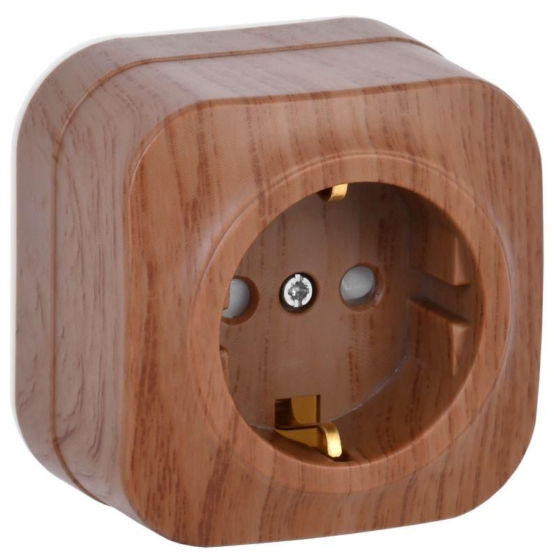 Розетка 1-местная наружная с заземлением и защитной шторкой 16А дуб совместима с обычными европейскими вилками типа F (Schuko) и C. Устанавливается в наружную распределительную коробку или на стену через монтажную планку. Для монтажа требуются два самореза и провода сечением не менее 2,5 мм2. Клеммы рассчитаны на жилы до 2,5 мм2 - не используйте более толстые провода. Подключение выполняйте после отключения питания. Корпус имеет углубления под кабельный ввод - можно использовать гермовводы для усиленной герметизации.