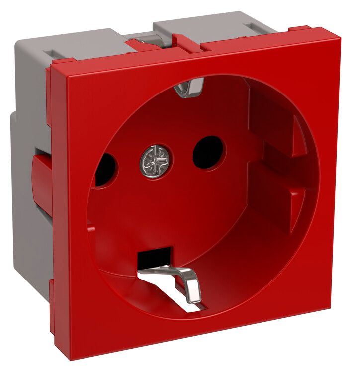 Розетка силовая с заземлением 2-к (на 2 модуля) 45х45 красная РКС-20-32-П-К оснащена тройной защитой: дифференциальным токовым автоматом (защита от утечек), устройством против перенапряжений и механическими шторками, препятствующими доступу к контактам. Соответствует требованиям ТУ 2291-001-1436938-2008. Обеспечивает класс безопасности II - двойная изоляция. Индикация выполнена выпуклым символом для быстрого определения положения.
