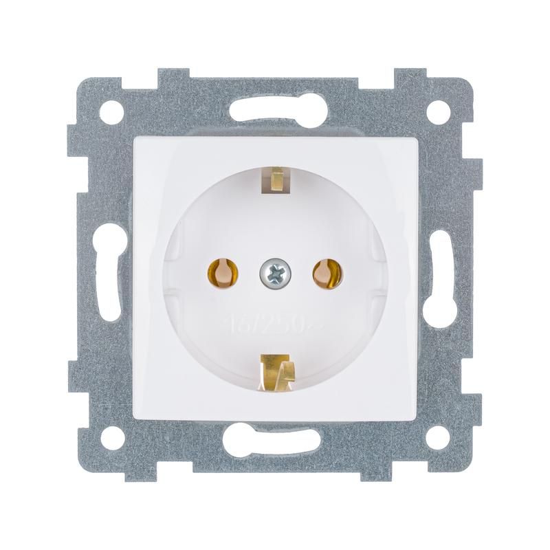 Розетка с заземлением 16А IP20, механизм белый от бренда Кунцево-Электро, артикул 110019 - это надёжный бытовой контакт для подключения устройств с заземлением, подходящий для установки в жилых и офисных помещениях внутри помещений.